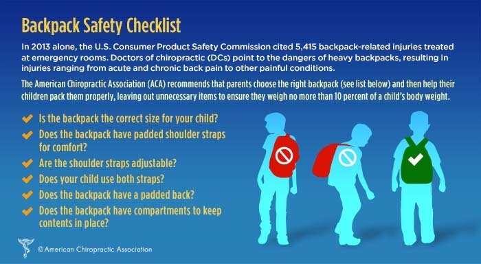 A trendy style backpack may be at the top of a students must-have list, but purchasers should look for other criteria as well. According to the U.S. Consumer Product Safety Commission, backpack-related injuries send an estimated 5,000 students per year to emergency rooms. More than 14,000 students are treated annually for injuries. And as any chiropractor will confirm, countless more suffer from unnecessary neck and back pain from heavy or improperly worn backpacks.