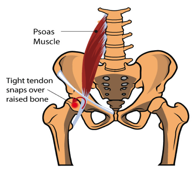 The muscle responsible for flexing your hip toward your trunk, is called the Psoas. This muscle begins on your lower spine and passes through your pelvis to attach onto the top of your femur (thigh bone). Along this course, the muscle travels across the front of your hip socket and over several bony prominences. If the muscle is too tight, its tendon may rub over these “bumps”. This occasionally produces an audible snapping sound, hence the moniker, “snapping hip”, aka “psoas tendinopathy”.